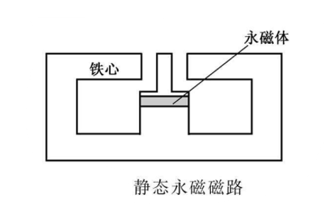 永磁磁路按永磁體的工作狀態(tài)不同可分為靜態(tài)永磁磁路和動(dòng)態(tài)永磁磁路。靜態(tài)永磁磁路有固定氣隙,工作狀態(tài)保持一定,主要存在于儀表、揚(yáng)聲器等,圖為一靜態(tài)永磁磁路。動(dòng)態(tài)永磁磁路的磁阻或外磁場處于變化之中,永磁體的工作點(diǎn)也隨之變化,永磁電機(jī)的磁路就是典型的動(dòng)態(tài)永磁磁路。