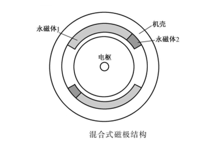 根據(jù)電機(jī)中永磁材料種類的多少,可分為單一式結(jié)構(gòu)和混合式結(jié)構(gòu)。在一臺(tái)電機(jī)中,只采用一種永磁材料,稱為單一式結(jié)構(gòu),絕大多數(shù)電機(jī)都采用該種結(jié)構(gòu)。若同一臺(tái)電機(jī)中采用兩種或兩種以上永磁材料,則稱為混合式結(jié)構(gòu)?;旌鲜浇Y(jié)構(gòu)通常采用兩種性能特點(diǎn)不同的永磁體,揚(yáng)長避短,充分發(fā)揮永磁材料的優(yōu)勢,提高電機(jī)的性能,降低制造成本。如下圖為永磁直流電動(dòng)機(jī)中的混合式磁極結(jié)構(gòu),將矯頑力低的永磁體1(如鐵氧體)置于磁極的前部,將矯頑力高的永磁體2(如釹鐵硼)置于磁極的后部。