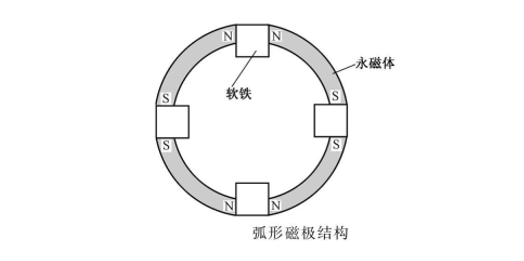 弧形磁極構(gòu)成的磁路系統(tǒng)如下圖所示。這種磁極為圓弧形,沿著圓弧方向充磁,其特點(diǎn)是每極的磁通由兩塊永磁體并聯(lián)提供,充磁方向長度大,適合于鋁鎳鈷永磁。