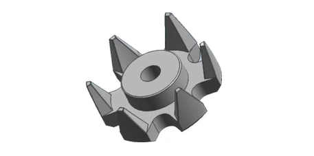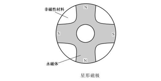 星形磁極結(jié)構(gòu)如下圖所示,結(jié)構(gòu)比較復(fù)雜,采用直接澆鑄的方法,極間部分采用非磁性材料(如鋁合金)澆鑄,可以提高其強(qiáng)度并具有阻尼作用。其優(yōu)點(diǎn)是制造和裝配工藝簡單,但充磁困難,磁化不均勻。